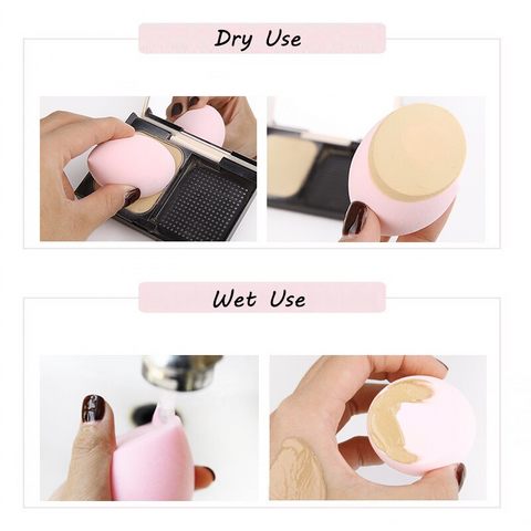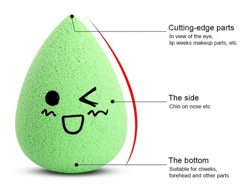 Water Drop Shape Cosmetic Puff is used best with liquid makeup, such as any liquid primers, foundations, concealers, eye shadows, or blushes. Primer, foundation, and blushes should be applied with the large base of the Beauty Blender sponge. Anytime makeup is applied to the forehead, cheeks, or chin, the base of the sponge should be used.