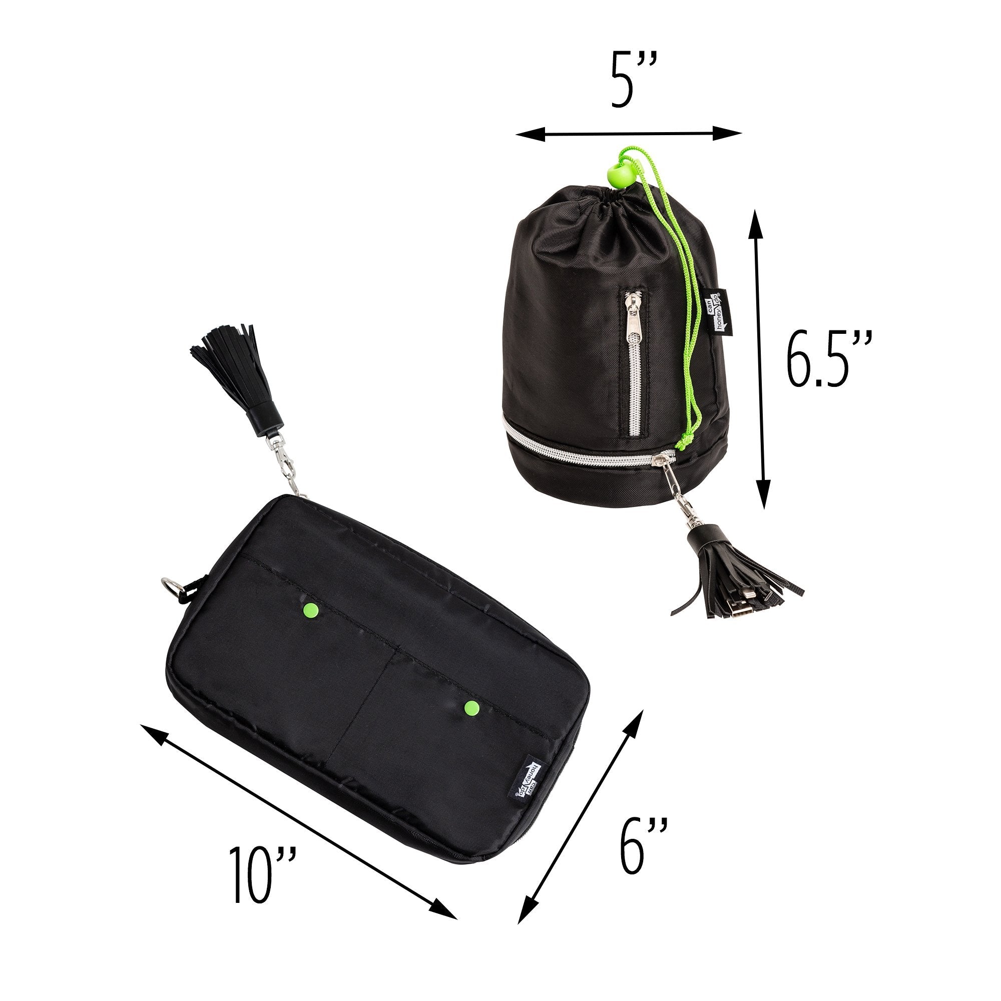 - Dimensions: Drawstring Pouch: 5”L x 5”W x 6.5”H; Clutch: 2”L x 10”W x 6”H